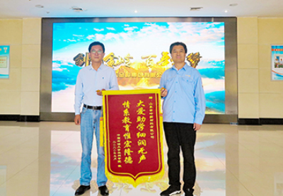 2020年5月28日,中國石油大學勝利學院后勤保障處黨總支書記劉云飛到東營公司送上一面繡有“大愛助學細潤無聲 情系教育惟宏隆德”的錦旗,對公司前段時間向學校無償捐贈消毒液表示感謝。劉云飛說,在疫情防控和學生返校的關鍵時期,金嶺集團雪中送炭向學校愛心捐贈防疫物資,有效緩解了學校防疫物資緊缺的局面,彰顯了企業的大愛情懷和擔當精神,學校將管好用好這批消毒液,絕不辜負愛心企業的善行義舉,確保全校師生的身體健康和生命安全。