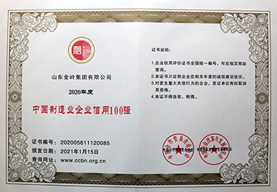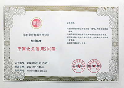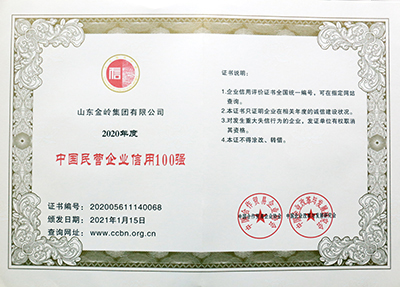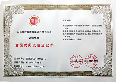 2021年1月16日,由中國合作貿(mào)易企業(yè)協(xié)會、中國企業(yè)改革與發(fā)展研究會主辦的“2021中國企業(yè)信用發(fā)展論壇暨第十二屆誠信公益盛典”在北京隆重召開。在會上,金嶺集團(tuán)獲評“中國AAA級信用企業(yè)”,總裁趙棟獲評“全國優(yōu)秀誠信企業(yè)家”。會議還發(fā)布了2020年度中國企業(yè)信用500強(qiáng)系列榜單,金嶺集團(tuán)成功入圍“中國企業(yè)信用500強(qiáng)”、“中國制造業(yè)企業(yè)信用100強(qiáng)”、“中國民營企業(yè)信用100強(qiáng)”,受到大會表彰。多年來,金嶺集團(tuán)始終高度重視企業(yè)誠信體系建設(shè),不斷加強(qiáng)合同履約考核,提升了全體員工的誠信意識,營造了“守信光榮,失信可恥”的氛圍,樹立了良好的企業(yè)信用形象。