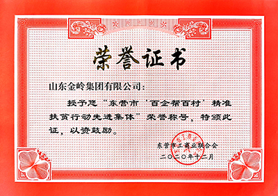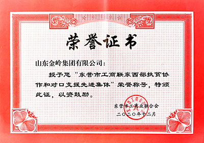 2021年4月,東營(yíng)市工商業(yè)聯(lián)合會(huì)授予山東金嶺集團(tuán)有限公司“東營(yíng)市工商聯(lián)抗擊新冠肺炎疫情先進(jìn)集體”、“東營(yíng)市工商聯(lián)東西部扶貧協(xié)作和對(duì)口支援先進(jìn)集體”、“東營(yíng)市百企幫百村精準(zhǔn)扶貧行動(dòng)先進(jìn)集體”榮譽(yù)稱號(hào),以表彰公司發(fā)展不忘回饋社會(huì)、踐行企業(yè)社會(huì)責(zé)任的可貴精神。公司在多年來(lái)的發(fā)展歷程中,始終不忘創(chuàng)業(yè)初心,積極參與愛(ài)老敬老、捐資助學(xué)、扶貧濟(jì)困、慈善賑災(zāi)、幫扶農(nóng)村建設(shè)等活動(dòng),為各項(xiàng)公益事業(yè)發(fā)展做出了突出貢獻(xiàn)。