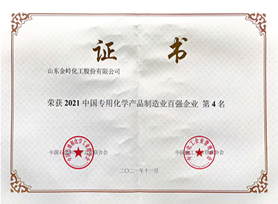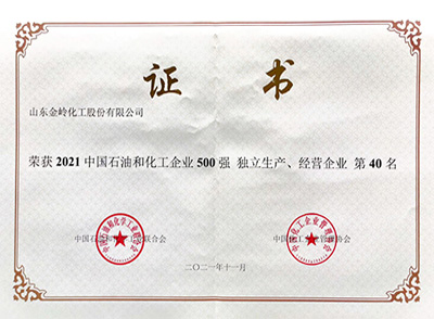 2021年11月29日,在中國石油和化學工業(yè)聯合會、中國化工企業(yè)管理協(xié)會聯合舉辦的“2021中國石油和化工企業(yè)500強發(fā)布會”上,山東金嶺化工股份有限公司榮獲“2021中國石油和化工企業(yè)500強獨立生產、經營企業(yè)”第40名、“2021中國專用化學產品制造業(yè)百強企業(yè)”第4名。
