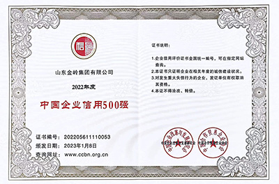 2023年1月8日,在中國企業改革與發展研究會、中國合作貿易企業協會主辦的“2023中國企業信用發展論壇暨第十四界誠信公益盛典”會議上,金嶺集團榮獲2022年度 “中國企業信用500強” 、“中國制造業企業信用100強”、“中國民營企業信用100強”、“培育誠信經營、守信踐諾標桿企業”榮譽稱號。多年來,公司始終高度重視企業誠信體系建設、加強合同履約考核,提升全體員工誠信意識,樹立了良好的企業信用形象。