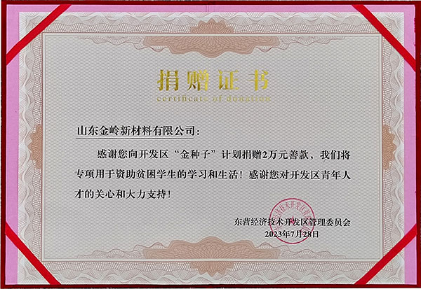 2023年7月28日,東營青年人才“背包E棧”啟動儀式暨悅來湖人才街區開街活動在開發區悅來湖人才街區舉行,山東金嶺新材料有限公司作為“金種子”贊助單位為活動贊助資金兩萬元,東營經濟技術開發區黨工委書記、管委會主任康茂禮為公司頒發榮譽證書,并對公司在開發區人力資源和社會保障方面做出的貢獻給予充分肯定。