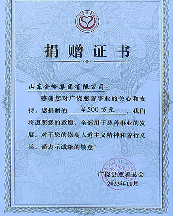 2023年11月29日下午,在廣饒縣樂安大廈召開廣饒縣慈善捐贈大會上,山東金嶺集團有限公司捐贈500萬元,并被評為“2020-2022年度廣饒慈善榜最具愛心企業”,縣長王學春、縣委書記陳偉頌對公司在慈善捐贈方面慷慨解囊給予高度評價,陳書記指出:“金嶺集團具有新時代民營企業強烈的社會責任感和大企業的擔當精神”。
