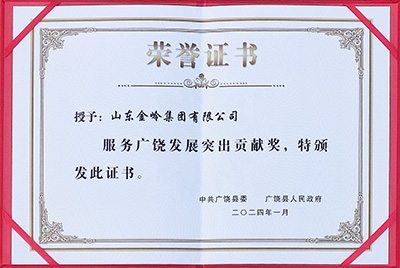2024年1月19日,在廣饒縣委、縣政府召開的全縣新型工業化推進大會上,山東金嶺集團有限公司被授予“服務廣饒發展突出貢獻獎”榮譽稱號,以表彰公司對地方經濟發展做出的突出貢獻。