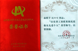 近日,集團公司董事長趙曰嶺被山東省工商聯合會授予“山東省工商聯系統抗震救災先進個人”榮譽稱號。