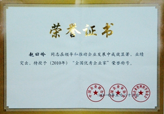 5月23日至24日,2010年全國企業(yè)家活動(dòng)日暨中國企業(yè)家年會在湖南長沙舉行,會議揭曉我國企業(yè)界最高獎(jiǎng)項(xiàng)——“全國優(yōu)秀企業(yè)家”獎(jiǎng)并舉行表彰儀式,公司董事長趙曰嶺榮獲“全國優(yōu)秀企業(yè)家”稱號。